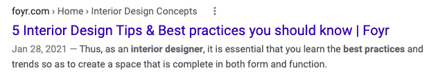 Title tags are a top SEO ranking factor and should include the keywords the page targets. For example, the page below targets the terms “Interior Design Tips” and “Interior Design Best Practices”.